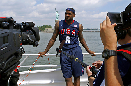 LeBron James of the US men's Olympic basketball team speaks to the media near the Statue of Liberty during a team promotional trip on a tour boat in New York Harbor, June 30, 2008. [Agencies] Track and Field Team Uniforms