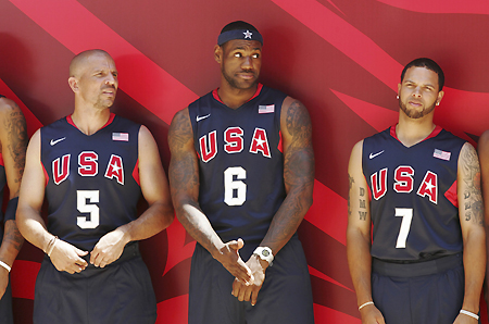 Members of the US men's Olympic basketball team (L to R) Jason Kidd, LeBron James and Deron Williams pose together in their official uniforms for photographs during a team promotional event at Rockefeller Center in New York, June 30, 2008. [Agencies] Track and Field Team Uniforms