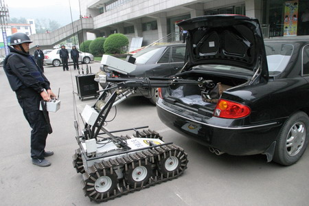 A policeman controls a robot to defuze bomb placed in the trunk of a car during the "Taishan Mountain 2008" drill in Jinan, capital city of east China's Shandong province, June 30, 2008. The exercise aims to improve the city's ability to combat terrorism. [Xinhua]
