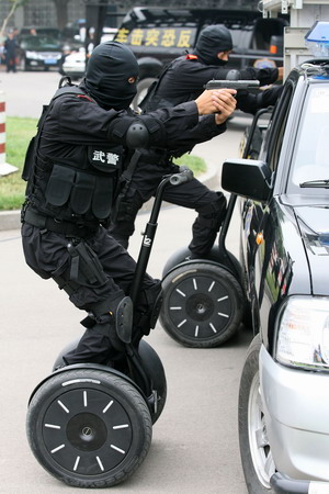 Police aim at "terrorists" during the "Taishan Mountain 2008" drill in Jinan, capital city of east China's Shandong province, June 30, 2008. The exercise aims to improve the city's ability to combat terrorism. [Xinhua]