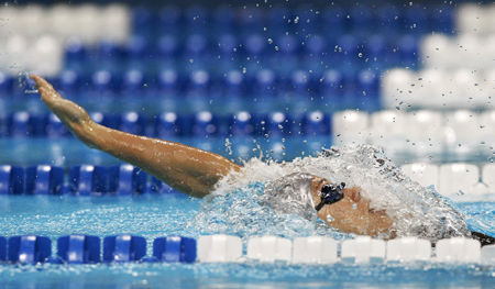 Natalie Coughlin swims to win her preliminary heat of the Women's 100m Backstroke setting a new world record time of 59.03 at the US Olympic Swimming Trials in Omaha, Nebraska, June 30, 2008. [Agencies]