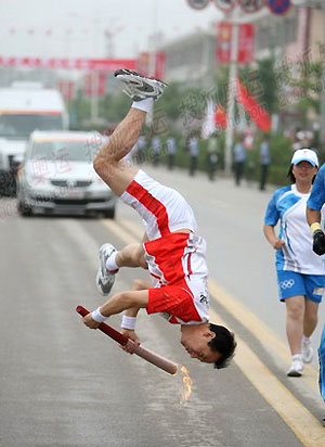 The 39th torchbearer, Wei Wei, performs a somersault during his leg of the torch relay wowing onlookers. The Olympic torch relay in Yan'an, Shaanxi Province, set off July 2, 2008. [www.beijing2008.cn]