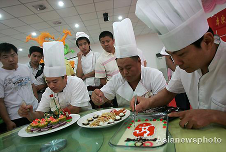 Chefs work on their Olympic-themed courses in Tianjin, July 2, 2008. More than 100 chefs in Tianjin participated in an Olympic-themed culinary competition. [Asianewsphoto]