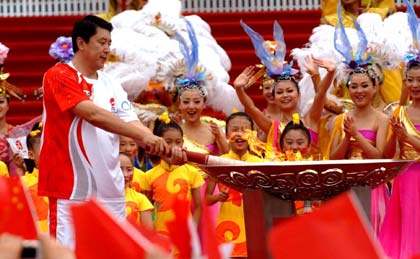 Torch bearer Wang Libin light the Olympic caldron during the Xi'an leg relay in Northwest China's Shaanxi Province July 4, 2008. [Xinhua]