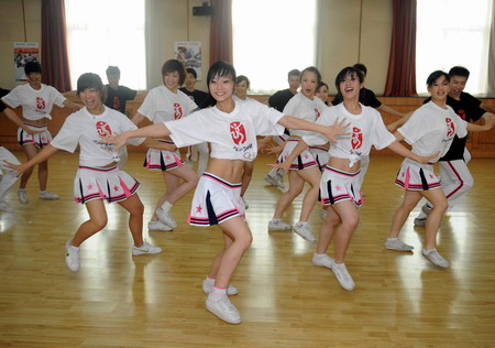 Members of professional cheerleading squad practise during a training session for the 2008 Beijing Olympic Games and Paralympic Games in Dachang County in Hebei province July 4, 2008. [Xinhua]