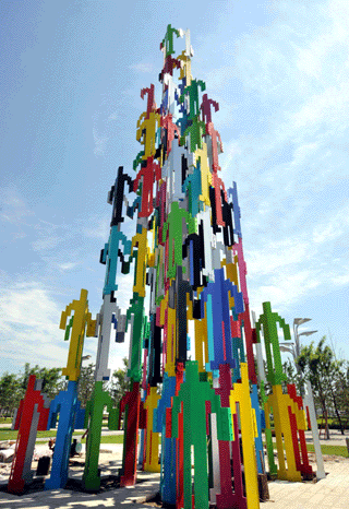 An Olympic sculpture "Unity is Strength" stands in the center of the Beijing Olympic Forest Park. More than 80 sculptures have been installed in the park, showing the Olympic spirit of "Higher, Faster and Stronger". [Xinhua]