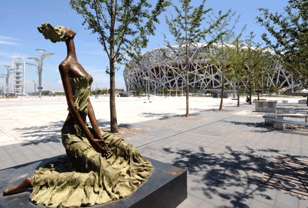 An Olympic statue "Bright Eyes and Blonde Wrists" sits near the National Stadium, or Bird’s Nest in the Beijing Olympic Forest Park. More than 80 sculptures have been installed in the park, showing the Olympic spirit of "Higher, Faster and Stronger". [Xinhua]