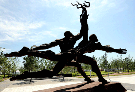 An Olympic sculpture called "Olympic Torch Relay" stands in the center of the Beijing Olympic Forest Park. More than 80 sculptures have been installed in the park, showing the Olympic spirit of "Higher, Faster and Stronger". [Xinhua]