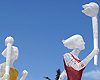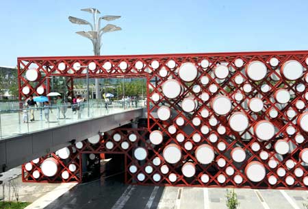 Visitors walk past a grid wall with drums inlaid at the man-made sinkage square in the Olympic Forest Park in Beijing, capital of China, July 6, 2008. The sinkage square is dubbed as "palace under ground", or "the corridor for traditional Chinese arts", which has seven "exhibition courtyards" like the ancient-styled Chinese palace gate, booth, chime, red walls in line, displaying traditional Chinese culture and arts to athletes and visitors from around the world. [Xinhua]