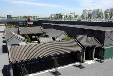 Photo taken on July 6, 2008 shows Chinese courtyard houses at the man-made sinkage square in the Olympic Forest Park in Beijing, capital of China.[Xinhua]