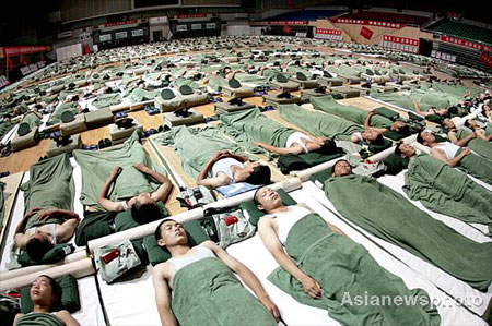 Officials and soldiers responsible for security in the Qinhuangdao division of the Beijing Olympic Games sleep on the floor of the Beijing Olympic Basketball Gymnasium after a whole day patrolling, anti-terrorism drills and military exercises, July 9, 2008. [Asianewsphoto]