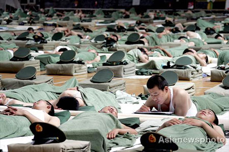 Zang Chengrun, a soldier from the cannon squadron writes in his notebook before falling asleep. [Asianewsphoto]