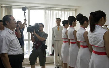 Four models pose in their official make-up and hairstyles, that the medal presenters will wear during the victory ceremonies at the Beijing Olympic Games, in Beijing, July 11, 2008. [BOCOG]