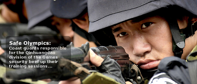 Officers and soldiers who are part of the Qinhuangdao division of the Beijing Olympic Games security take part in a training session to improve their ability to deal with emergencies, July 13, 2008. [Xinhua]