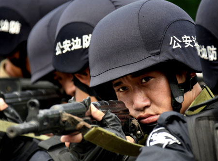 Officers and soldiers who are part of the Qinhuangdao division of the Beijing Olympic Games security take part in a training session to improve their ability to deal with emergencies, July 13, 2008. [Xinhua]