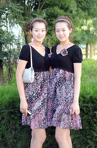 Twin sisters Li Xiaoye(L) and Li Ziye, 19 years old, pose for a photo in Beijing, July 12, 2008. The Li sisters will be among the 337 potential medal presenters for the victory ceremonies at the Beijing Games. [Xinhua]