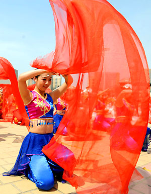 Dancers celebrate the torch's arrival during the Changchun leg in Jilin province on July 14,2008. [Xinhua]