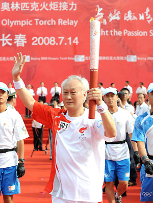 Torchbearer, scientific researcher Wang Jiaqi, runs with the torch during the Changchun leg in Jilin province on July 14, 2008. [Xinhua]