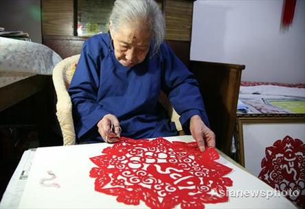 Hu Jiazhi, a 112-year-old artist in Nanjing makes a paper cut, July 15, 2008. It took her more than a month to finish three paper cuts. In each one, there is the Olympic Chinese seal, the five Olympic rings, lucky clouds and eight doves, which represent luck, peace and unity. The elderly artist will pick her favorite one and present it to the Beijing Olympic Committee as a gift through the Nanjing Artists' Association.[Asianewsphoto]