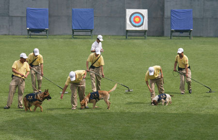Members of the security team for the Beijing Olympic Games inspect the Beijing Olympic Green Archery Field with sniffer dogs. The Beijing Olympic security team conducted safety inspections of all the venues within the Olympic Green on July 16, 2008. [Xinhua]