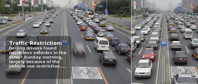 Cars with even number plates travel on a road in Beijing, July 20, 2008. Traffic restrictions came into affect in Beijing on Sunday in an attempt to improve the capital's air quality and traffic situation for next month's Olympics. Cars will be banned on alternate days depending on whether their license plates end in odd or even numbers. Beijing hopes to take the city's 2.2 million cars off the roads and reduce emissions by 63 percent for a two-month period. [Agencies]