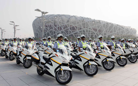 The Beijing Olympic emergency team to deal with traffic situations stands ready in front of the National Stadium or "Bird's Nest", July 20, 2008. The Olympic transportation security drill was held in the Beijing Olympic area on the same day. [Xinhua]