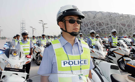 Members of the Beijing Olympic emergency team that deals with traffic situations stand by in front of the National Stadium or "Bird's Nest", July 20, 2008. The Olympic transportation security drill was held in the Beijing Olympic area on the same day. [Xinhua]