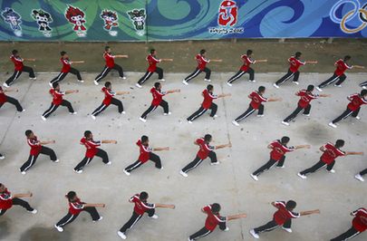Students from the Tagou martial arts school from Henan province practise at a training base on the outskirts of Beijing July 18, 2008. More than 2,000 students from Tagou martial arts school will perform during the opening ceremony of 2008 Beijing Olympic Games and have been training on the outskirts of Beijing for a year, local media reported. Picture taken July 18, 2008. [Agencies]