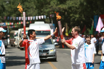 Werner Ebel from Germany (right) and another bearer high-five each other.