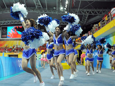 Beijing Olympic volunteers perform a cheerleading routine at the Beijing Institute of Technology Gymnasium during the briefing and pep rally for the Beijing Olympic and Paralympic Games, July 20, 2008. [Xinhua]