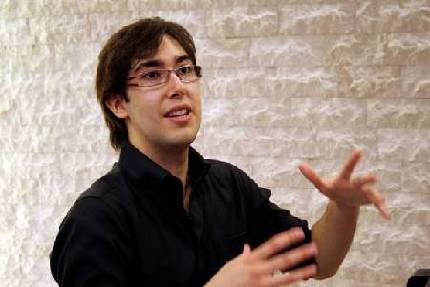 Canadian musician Carlo Aspri explains how he uses different musical styles from Asia and the West in his compositions during a performance in Beijing on Saturday. [photo by Marc Checkley/chinadaily.com.cn]