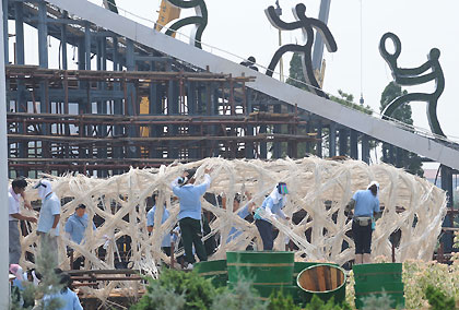 Workers build the framework in the shape of the Bird's Nest where flowers will be placed, on Tian'anmen Square in Beijing, July 22, 2008. The flowers will be kept on the square until the National Day holidays end on October 7. [Xinhua]