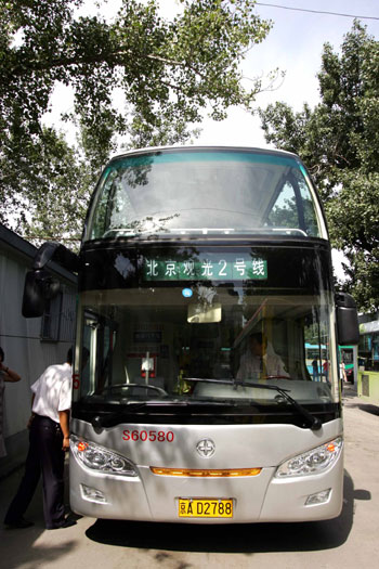 An exterior front view of the sightseeing double-decker bus Line 2, which passes some Olympic venues such as the National Stadium and National Aquatic Center is seen in this photo taken on July 17, 2008. The other bus Line 1 has the theme of "Ancient City" and goes by such historical areas as the Temple of Heaven, Tian'anmen Square, and Forbidden City. [Xinhua]