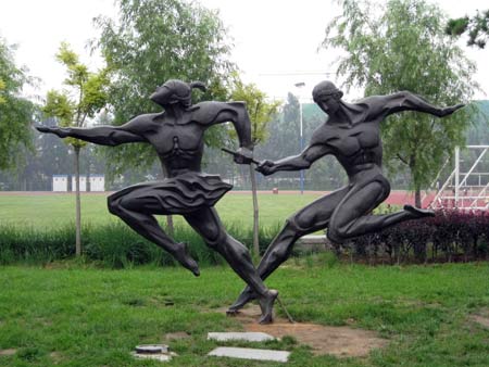 A photo taken on July 18, 2008 shows a sculpture named "The Relay" in the Qinhuangdao Olympic Park in north China's Hebei Province. This theme park featuring Olympic Games has a music fountain and Olympic sculptures. [Xinhua]