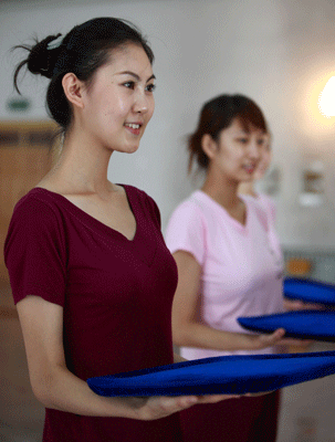 Olympic medal hostesses practice in Beijing July 23, 2008. A total of 337 medal hostesses have wrapped up training and are ready for the Olympics. [Xinhua]