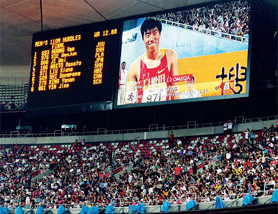 Spectators at the men's 110m hurdles during the"Good Luck Beijing" China Track and Field Open 2008, held on May 24 in the Bird's Nest, with Chinese hurdler Liu Xiang on the big screen. Many say the digital revolution could open up the Olympic experience to a far wider audience. [China Daily]