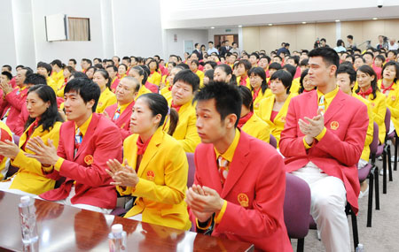 Yao Ming (R), China's national men's basketball team center, and other top athletes and sports officials pledge to 'play with honour' at the ceremony on the formation of the Chinese delegation to the Beijing Olympic Games in Beijing July 25, 2008. The 1,099-member delegation includes 639 athletes for the Games, which is to open on August 8. [Xinhua]