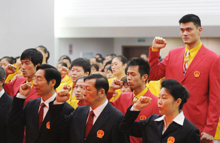 Yao Ming (R), China's national men's basketball team center, and other top athletes and sports officials pledge to 'play with honour' at the ceremony on the formation of the Chinese delegation to the Beijing Olympic Games in Beijing July 25, 2008. The 1,099-member delegation includes 639 athletes for the Games, which is to open on August 8. [Xinhua]