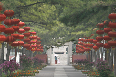 A mother and child walk past red lanterns at Ritan Park, one of three designated "protest parks" in Beijing July 25, 2008. [Agencies]