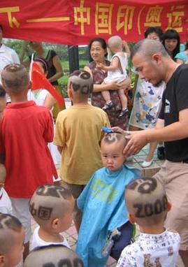 Wu Dasheng (R), a local barber, offers boys with haircut in the shape of the Beijing Olympic logo in Beijing, July 28, 2008. [Xinhua]
