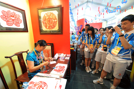 Volunteers watch folk artist Sun Erlin do paper-cutting at the Beijing Olympic Village July 28, 2008. The 47-year-old Sun from Inner Mongolia Autonomous Region will display her paper-cuttings at the Olympic Village during the Games. [Xinhua]