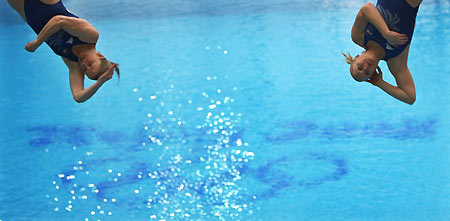 Members of the the British Olympic diving team practice during a training session at the National Aquatic Center or "Water Cube", in Beijing, July 30, 2008. The venue will host the swimming, diving and synchronized swimming events for the 2008 Olympic Games. [Xinhua]