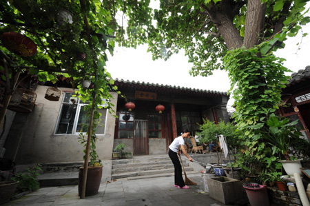 Service people clean the courtyard of the 33rd "Olympic homestay" located in Dajinsi Hutong in Xicheng District of Beijing. The Beijing Olympic organizers have unveiled 598 selected homestay households, offering 726 rooms for more than 1,000 potential guests during the upcoming summer Games.[Xinhua]