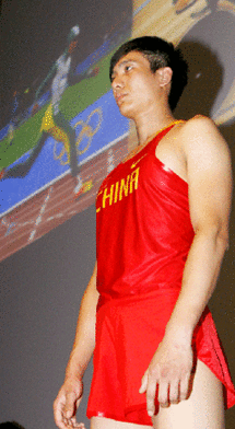 A model presents the jersey Chinese 110m hurdler Liu Xiang will wear during the Beijing Olympic Games, Beijing, July 31, 2008. Liu's running shoes and jersey were unveiled on Thursday. [Xinhua]
