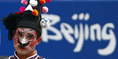 A performer stands outside the National Stadium, also known as the Bird's Nest, as he waits for the rehearsal of the Olympic Games opening ceremony to start in Beijing August 2, 2008. [Agencies]