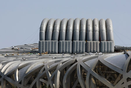 Workers prepare for a rehearsal of the opening ceremony for the Beijing 2008 Olympic Games next to an inflatable structure at the roof of the National Stadium, also known as the Bird's Nest, August 2, 2008. [Agencies]