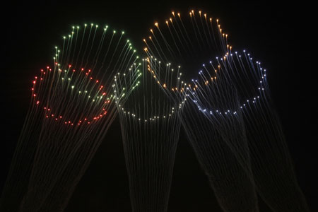 Fireworks explode with an Olympic logo over Beijing's Tian'anmen Square during a rehearsal of the opening ceremony for the Beijing 2008 Olympic Games August 2, 2008. [Agencies]