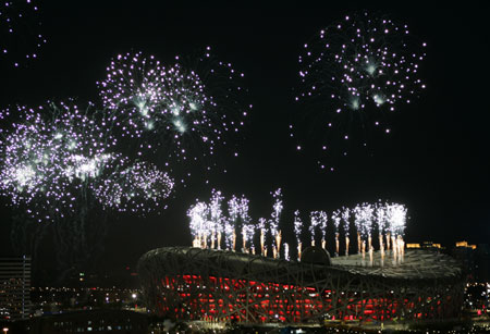 Fireworks explode over the National Stadium, also known as the Bird's Nest, during a rehearsal of the opening ceremony for the Beijing 2008 Olympic Games August 2, 2008. [Agencies]