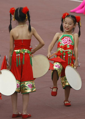 Performers talk in the National Stadium, also known as the Bird's Nest, ahead of a dress rehearsal for the opening ceremony of the Beijing 2008 Olympic Games August 2, 2008. [Agencies]