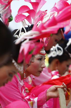 Performers remove their stilts before participating in a rehearsal for the Olympic Games opening ceremony in Beijing August 2, 2008. [Agencies]